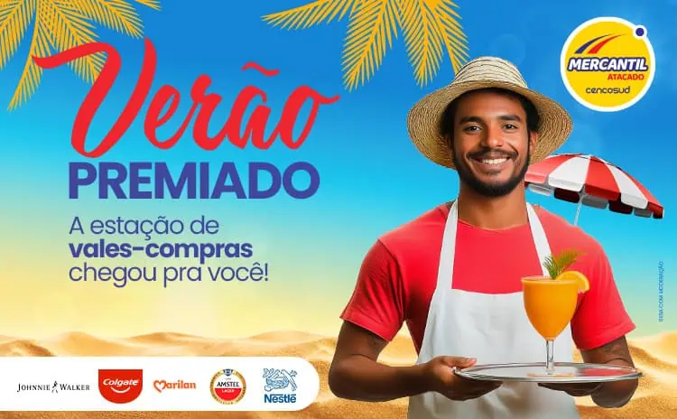 - Para participar da promoção “Verão Premiado Mercantil”,os clientes cadastrados no APP Mercantil Atacado deverão realizar suas compras no período período de 00h00 do dia 02 de janeiro de 2025 até o dia 03 de fevereiro de 2025 as 23h59 (horário de Brasília), a partir R$ 180,00 (cento e oitenta reais) em compras, cuja compra tenha sido identificada com o CPF do participante no PDV, o participantes poderá ser contemplado ou não com 01 (um) vale-compras da promoção.